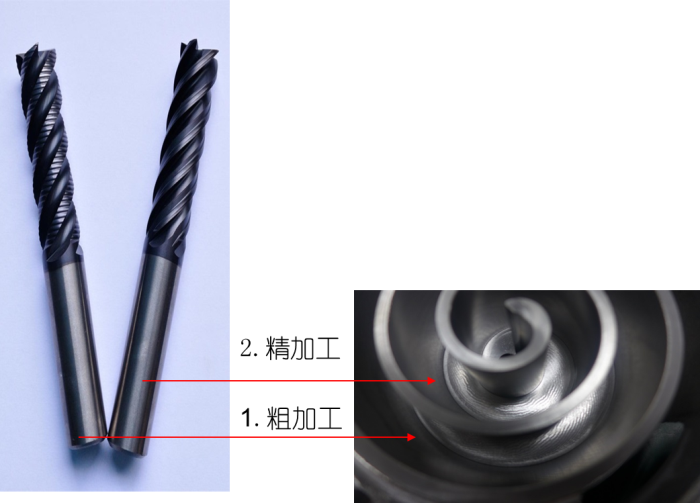 1.精铣刀: 采用不等齿距,变刃倾角设计,大幅提高抗振性及切削的稳定性。(Vc:100~120,每齿进给0.04)